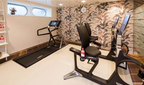 Onboard facilities include a restaurant serving gourmet cuisine, a lounge with panoramic views, a fitness centre, a heated pool on the sun deck, a beauty salon, and a massage and wellness area.