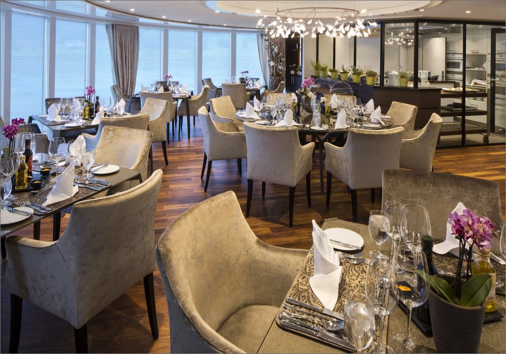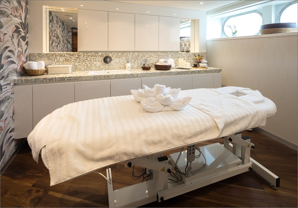 Onboard facilities include a restaurant serving gourmet cuisine, a lounge with panoramic views, a fitness centre, a heated pool on the sun deck, a beauty salon, and a massage and wellness area.