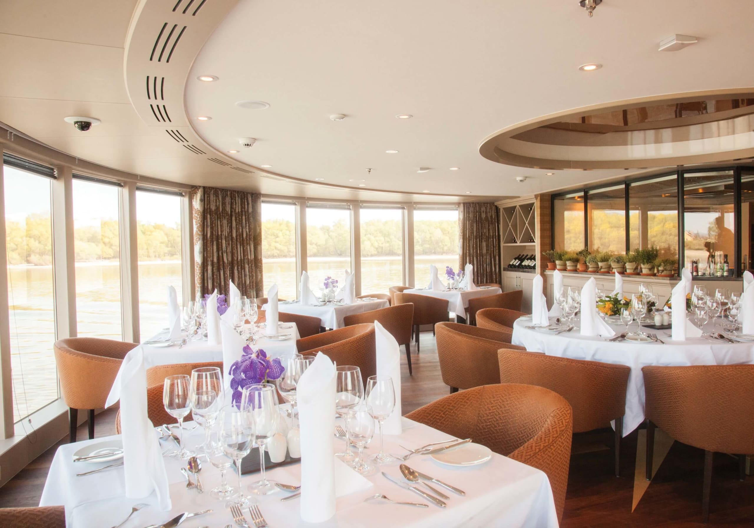 Guests can enjoy gourmet meals in the Main Restaurant, an intimate dining experience at The Chef’s Table, casual fare in the Main Lounge, and occasional alfresco dining on the Sun Deck.