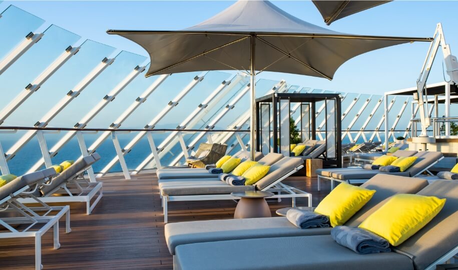 Edge AquaClass guests enjoy a state-of-the-art infinite veranda, king-size cashmere mattress bedding, soothing stateroom touches and complimentary fitness classes. Plus, unlimited access to the SEA Thermal Suite, complimentary dining at Blu restaurant, and a personal spa concierge.