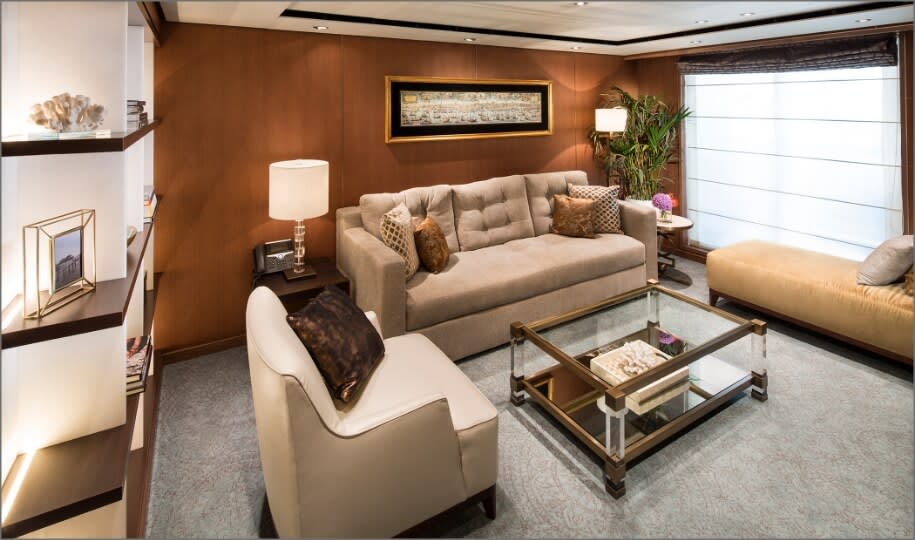 With a teak-lined verandah, floor-to-ceiling windows and comfortable sitting area, these comfortable suites are filled with light. They include two lower beds convertible to one queen-size bed—our signature Mariner’s Dream™ bed with plush Euro-Top mattresses, plus a shower with premium massage head and a refrigerator.