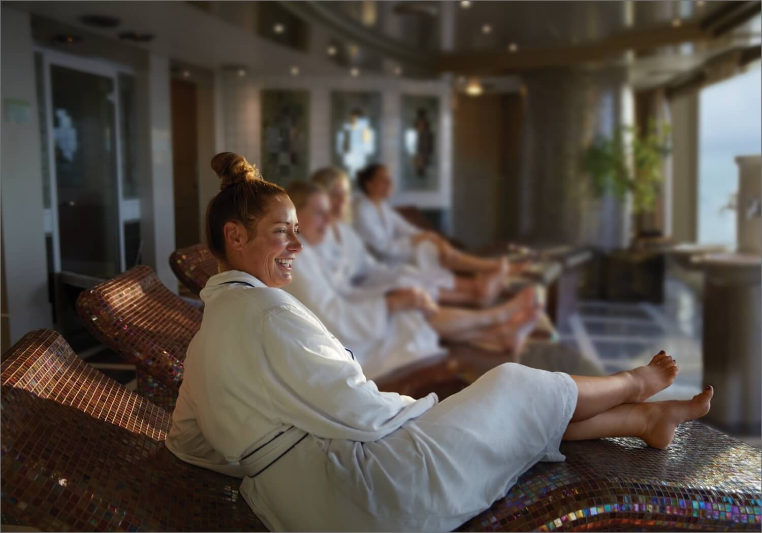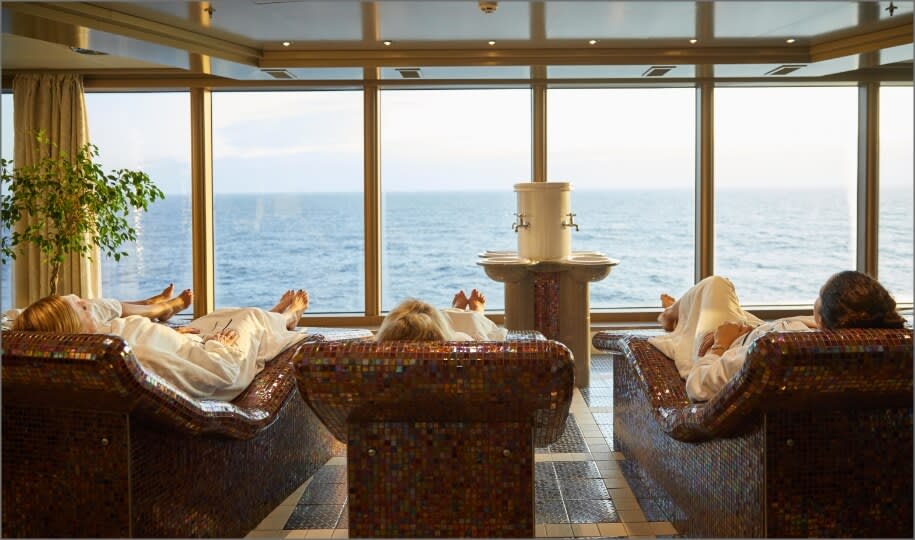 These staterooms feature spa amenities such as yoga mats and access to spa treatments from the Greenhouse Spa & Salon. Filled with light from floor-to-ceiling windows overlooking a private verandah, these staterooms include a sitting area, two lower beds convertible to one queen-size bed—our Signature Mariner’s Dream™ bed with plush Euro-Top mattresses, and bath tub with premium massage showerheads.