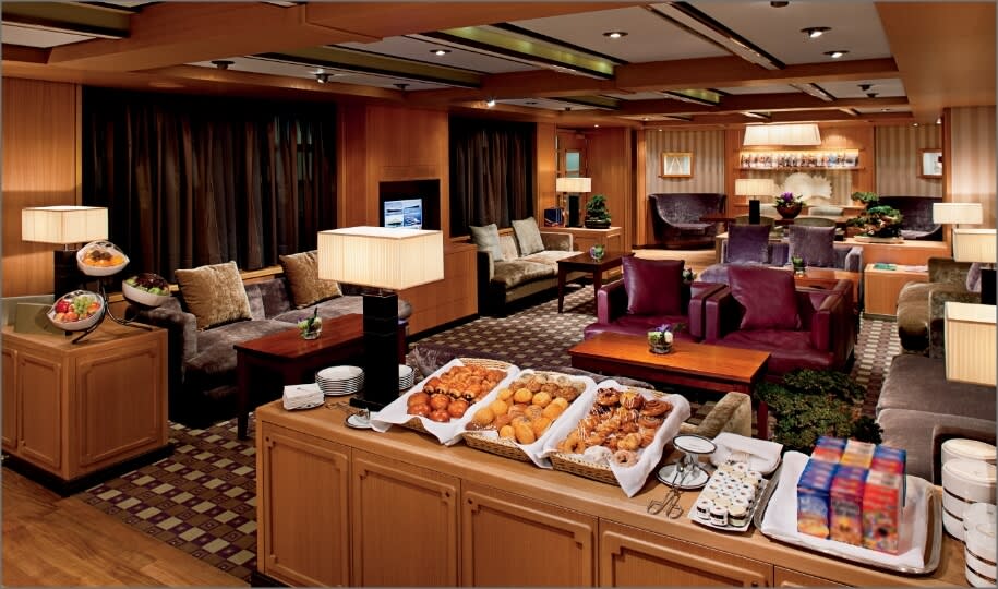 Generously proportioned and filled with light, these elegant suites include a living room, dining room, pantry with microwave and refrigerator, and floor-to-ceiling windows overlooking a private verandah with whirlpool. The bedroom features a king-size bed—our Signature Mariner’s Dream™ bed with plush Euro-Top mattresses, plus a separate dressing room and the bath includes an oversize whirlpool bath and shower as well as an additional shower stall. There’s also a sofa bed, suitable for two people, and a guest toilet. Amenities include a private stereo system, use of the exclusive Neptune Lounge, private concierge and an array of complimentary services.