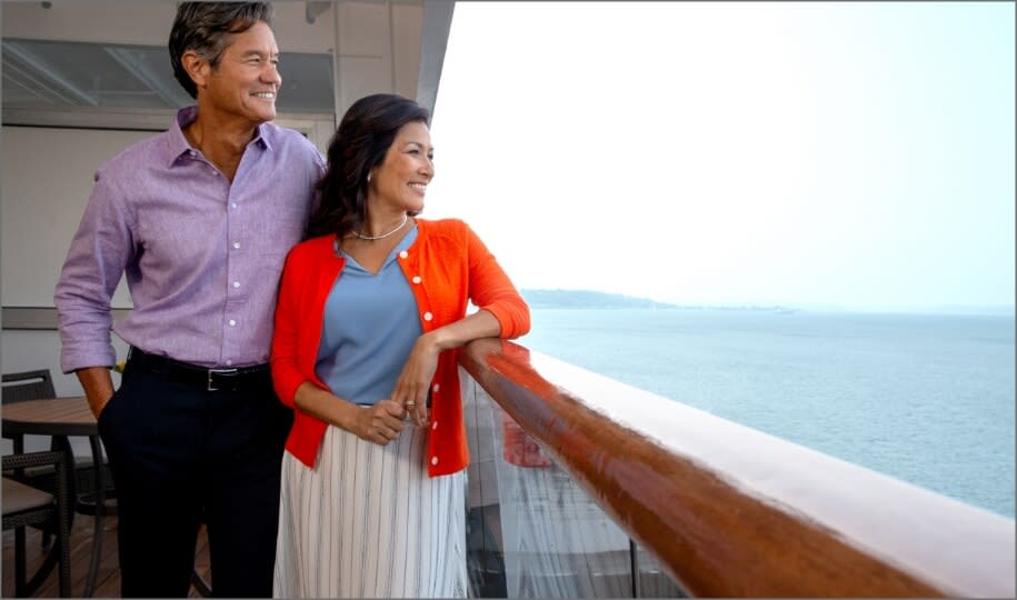 With a teak-lined verandah, floor-to-ceiling windows and comfortable sitting area, these comfortable suites are filled with light. They include two lower beds convertible to one queen-size bed—our signature Mariner’s Dream™ bed with plush Euro-Top mattresses, plus a whirlpool bath and shower, mini-bar and refrigerator.