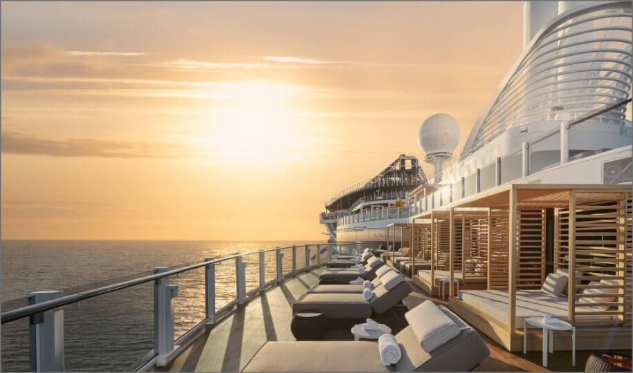 Marvel at the unparalleled views from the large, aft-facing balcony of these spacious, stylish Suites featuring two lower beds that convert to a queen and a double sofa bed. They also include butler and concierge service. Perfect for up to four guests to indulge in a picture-perfect holiday.