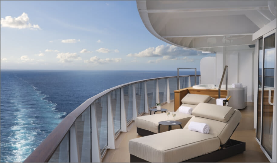 There is plenty of room for you to relax and take in the gorgeous views from the aft-facing balcony of these stylish Suites. Featuring two lower beds that convert to a queen, they can connect to a Club Balcony Suite, perfect for family or friends to spread out yet stay close. Includes butler and concierge, too.