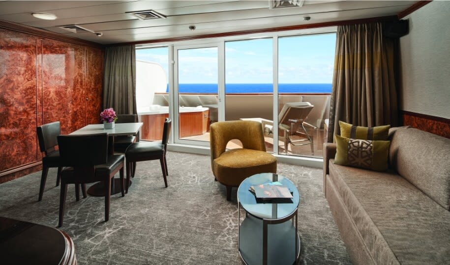 Up to four guests can stay in these Penthouses that come with a dining area and large private balcony. Because they are aft-facing, the view from your private balcony is truly stunning. Also features a bedroom with two lower beds that convert to a queen-size bed and luxury bath with whirlpool tub and shower. Includes butler and concierge service.