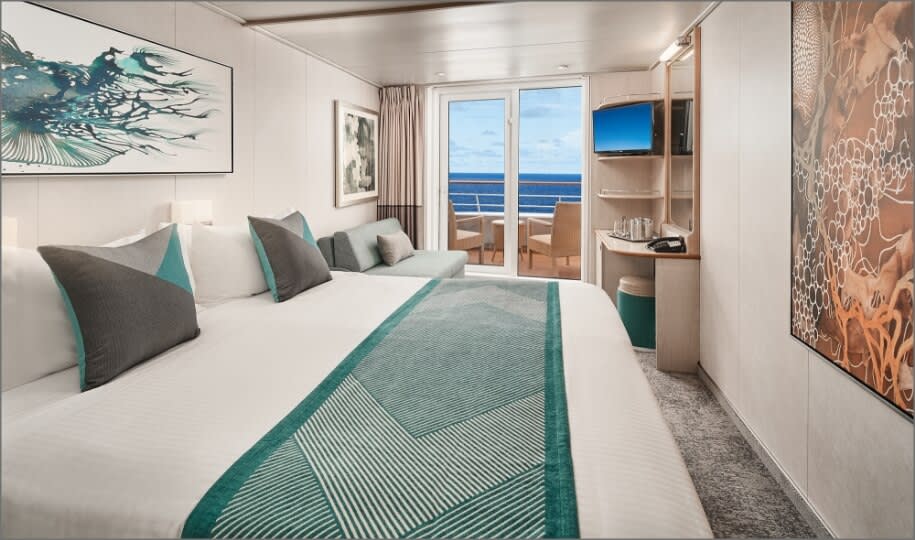 With room for up to three guests, these aft-facing staterooms offer incredible views. They feature two lower beds that convert into a queen-size bed and a single sofa bed to accommodate one more. Along with a sitting area, floor-to-ceiling glass doors and a private balcony to enjoy the views and fresh ocean breezes. Some have larger-than-normal balconies.