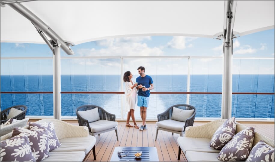 With room for up to three guests, these staterooms have two lower beds that convert into a queen-size bed and a single sofa bed to accommodate one more. Along with a sitting area, floor-to-ceiling glass doors and an aft-facing private balcony with a spectacular view.