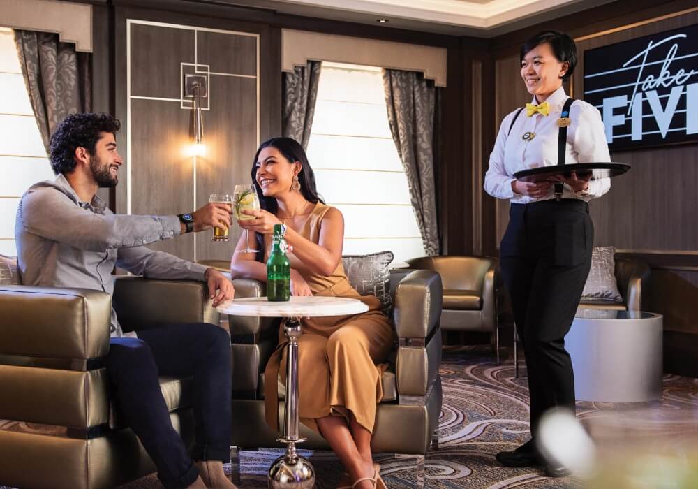 A premium stateroom category featuring our best located Mini-Suite staterooms, as well as the great amenities found in all Mini-Suites — plus premier dining benefits and luxurious perks. Each night, enjoy Club Class Dining, an exclusive dining area featuring expedited seating with no wait, additional menu options, dedicated wait staff and table-side preparations. Other amenities include priority embarkation and disembarkation, a complimentary one-time wine set-up and so much more!^Learn more about Club Class