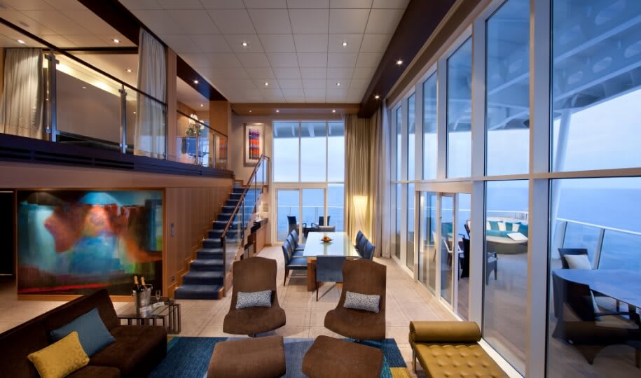Two-decks-high stateroom with panoramic views. On second level, master bedroom has a King size bed with Duxiana Mattress; bathroom with tub, shower, two sinks and bidet and a closet. On main level, second bedroom with closet and two twin beds that convert to Royal King; dining area with dry bar, living room with sofa that converts to double bed; bathroom with shower. Private balcony with whirlpool and dining area. Sleeps up to 6 guests. Stateroom: 1,524 sq. ft. Balcony (main level): 843 sq. ft.