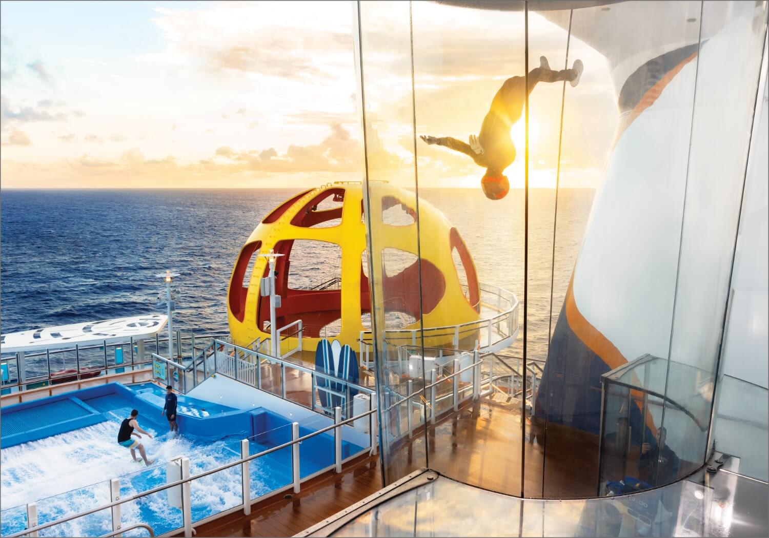 For families, there are more activities and shows than you’ll be able to fit into just one cruise, with laser tag, 4D Virtual Adventure Zones, skydiving and surfing simulators, an entire deck of pools and waterparks, a rock-climbing wall, dodgems, the SkyPad bungee trampoline experience, a whole host of shows and musical moments to enjoy, plus much, much more.
