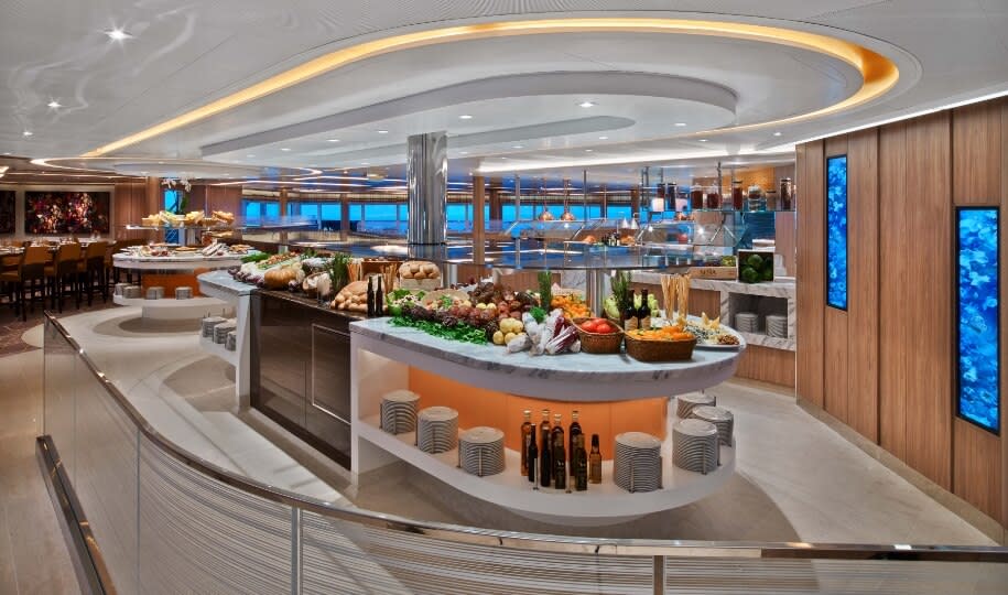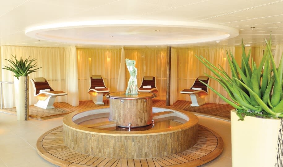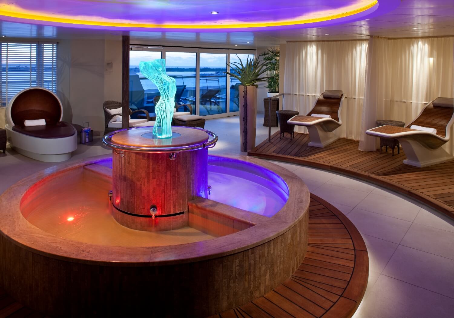 The cruise ship offers an impressive selection of fine dining options, seven distinct bars and lounges, as well as two outdoor swimming pools, multiple hot tubs and two meditation gardens.
