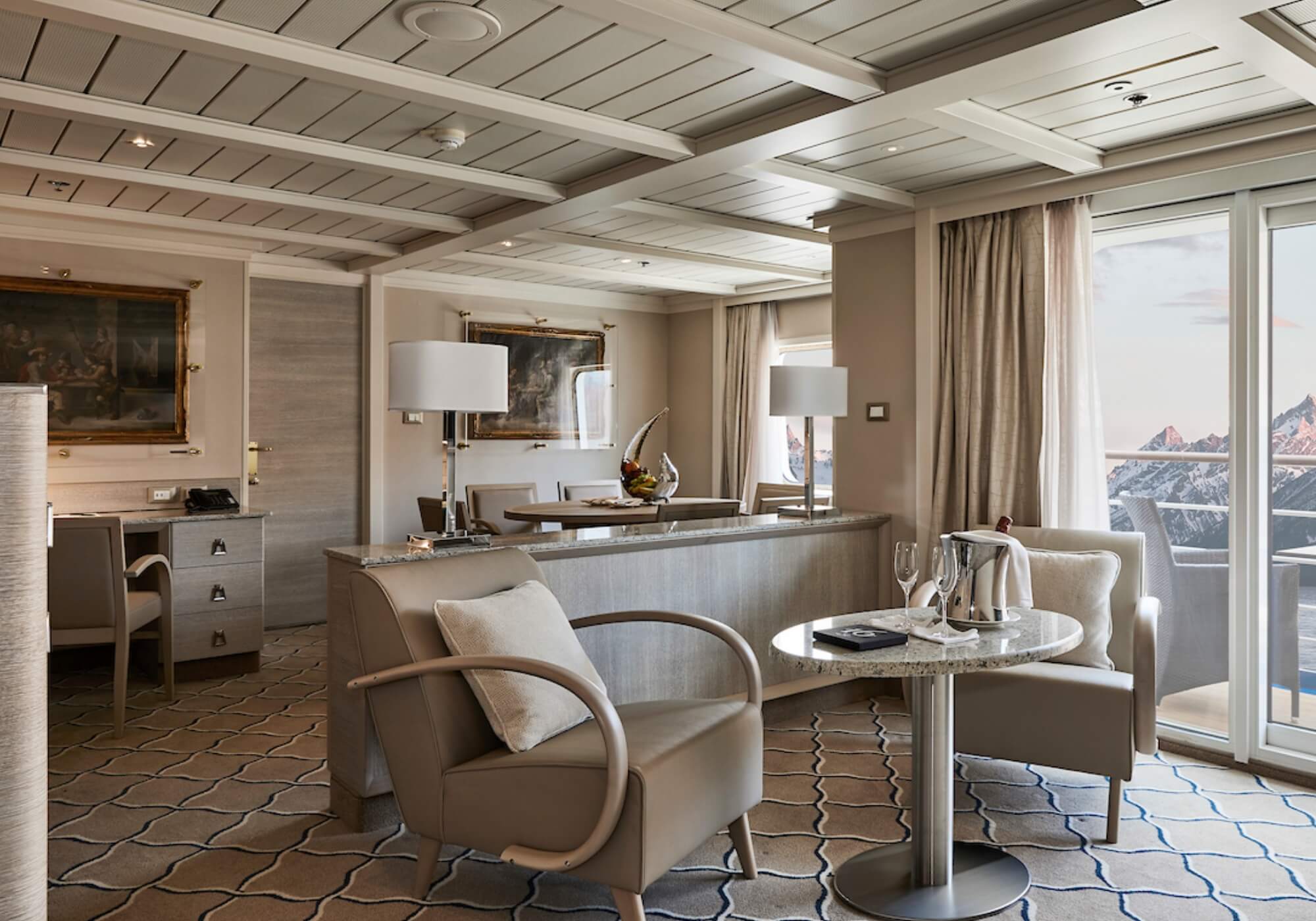 This charming and opulent suite offers a comfortable living space, close to the heart of the ship. Unwind in the sitting area or enjoy the romantic views of the setting sun from your private veranda.
