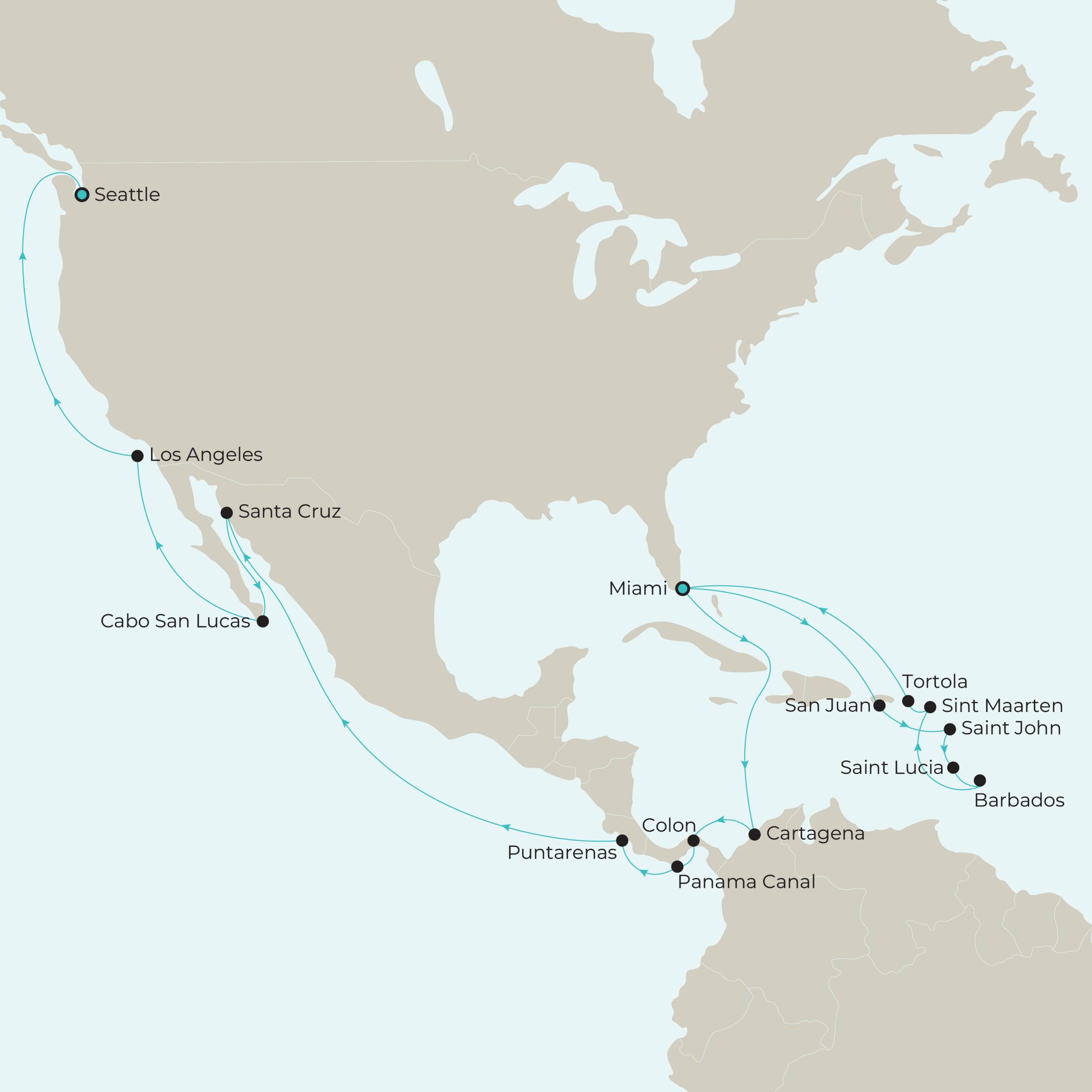 Combining the classic luxury of a Cunard voyage with the iconic spectacle of a Panama Canal transit, this itinerary brings together two bucket-list cruising experiences in one unforgettable trip. Begin with two nights in vibrant Miami, setting the stage for this once-in-a-lifetime adventure, followed by visits to some of the Caribbean’s most stunning islands.