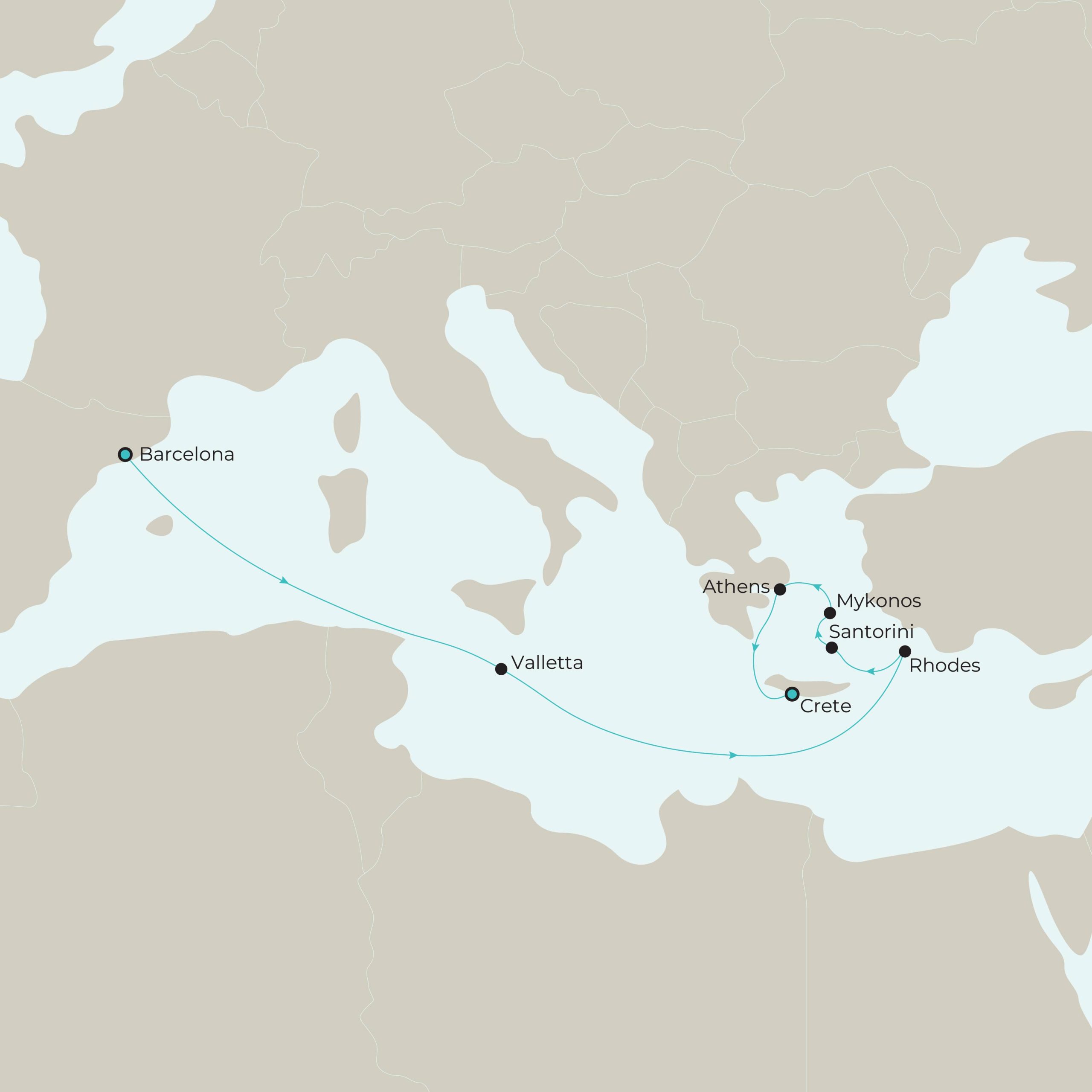 Begin your adventure in vibrant Barcelona then embark Celebrity Xcel® — the pinnacle of modern luxury at sea — featuring world-class entertainment, exciting activities, gourmet dining, and innovative wellness spaces for a truly unforgettable voyage. Explore breathtaking destinations including Valletta, Rhodes, Santorini, and Mykonos, each offering stunning views, rich history, and delicious local flavors. Crystal-clear turquoise waters surround these iconic ports, inviting you to discover their unique charm.