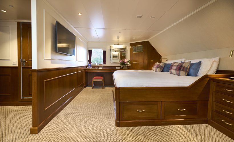 The Suites offer an indulgent retreat with expansive space and luxurious features. This beautifully appointed suite includes a spacious living area, a king-sized bed, and large windows that provide panoramic views of Scotland’s stunning landscapes. The elegant en-suite bathroom boasts high-end fixtures and premium amenities, ensuring a lavish experience. Designed for ultimate comfort, the suite also includes additional thoughtful touches for relaxation. Positioned on the John Buchan Deck, it provides both seclusion and convenient access to the ship’s main areas, perfect for discerning travellers.