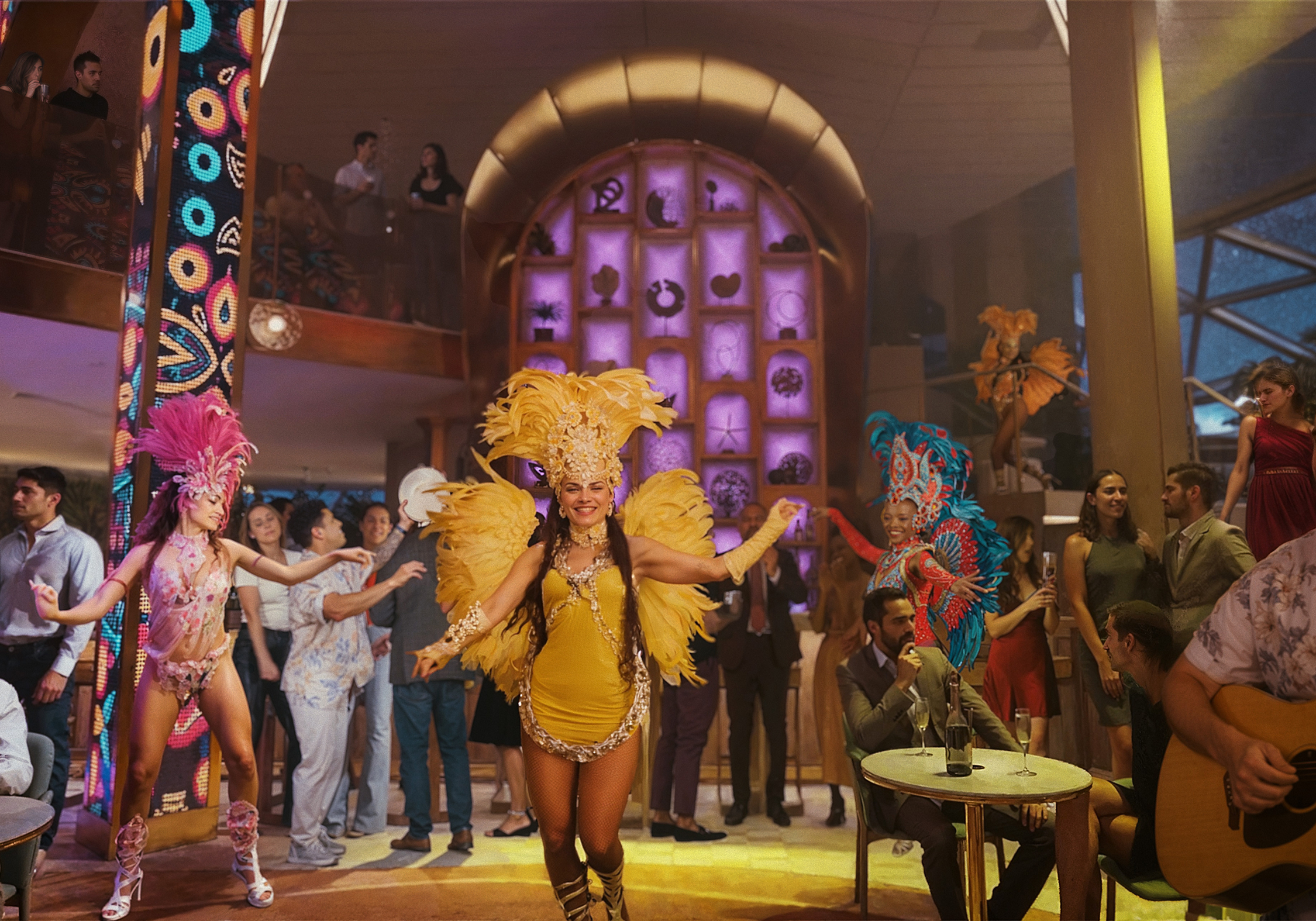 Onboard, guests can enjoy the return of the Magic Carpet, a cantilevered platform offering panoramic ocean views, and the expanded Rooftop Garden with infinity pools and shaded lounges. Dining options include 32 venues, such as Le Voyage by Daniel Boulud and the new al fresco Bora restaurant. Wellness is a priority, with AquaClass SkySuites featuring goop-curated amenities and spa-inspired bathrooms.