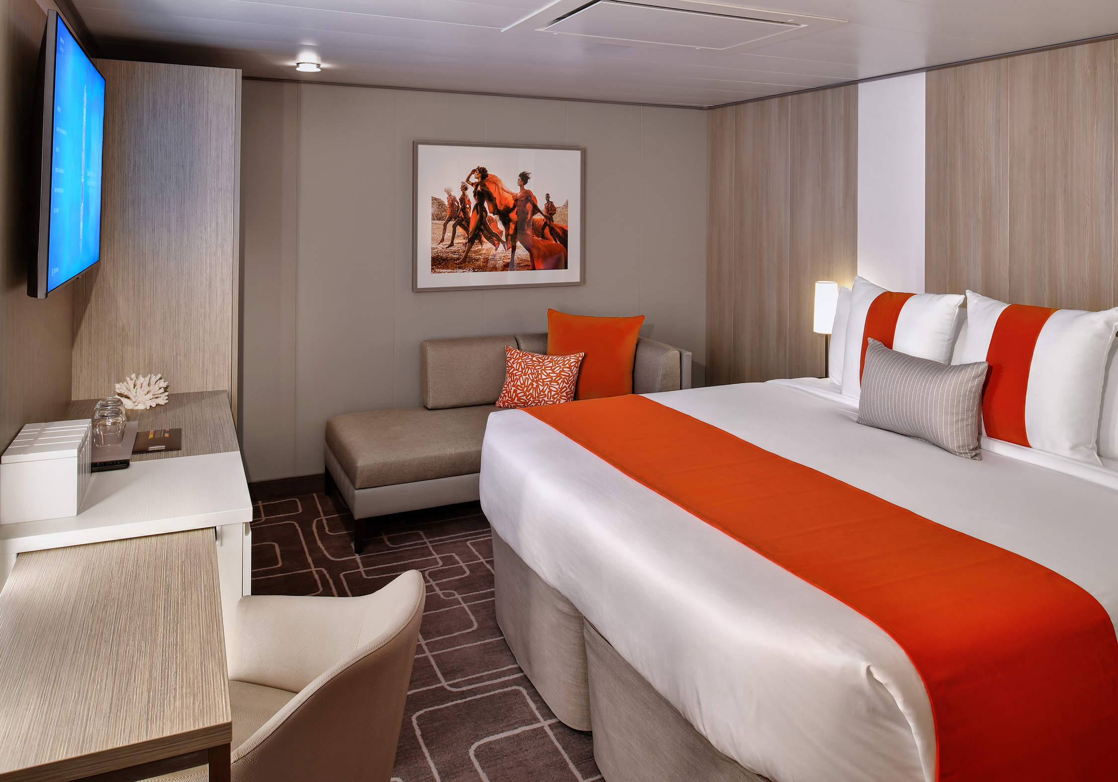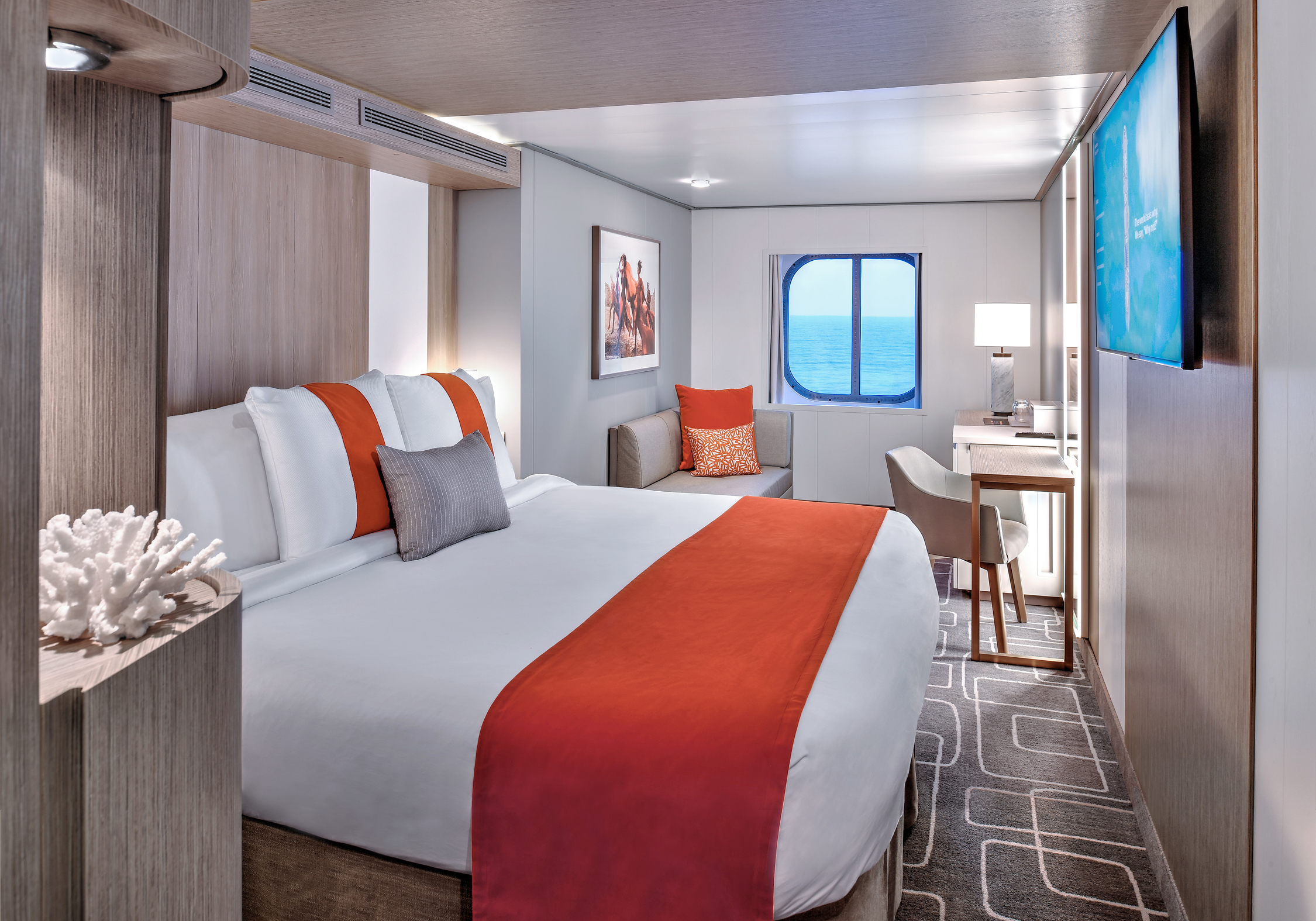 Staterooms with a large window and a sitting area where you can kick back and relax after a day that has been as busy or relaxing as you want it. Enjoy in-room automation that allows you to control everything from lighting, to temperature, and service with a simple touch screen. You can even choose a setting that will tuck you in and gently wake you in the morning. It’s world-class service at the touch of a button.