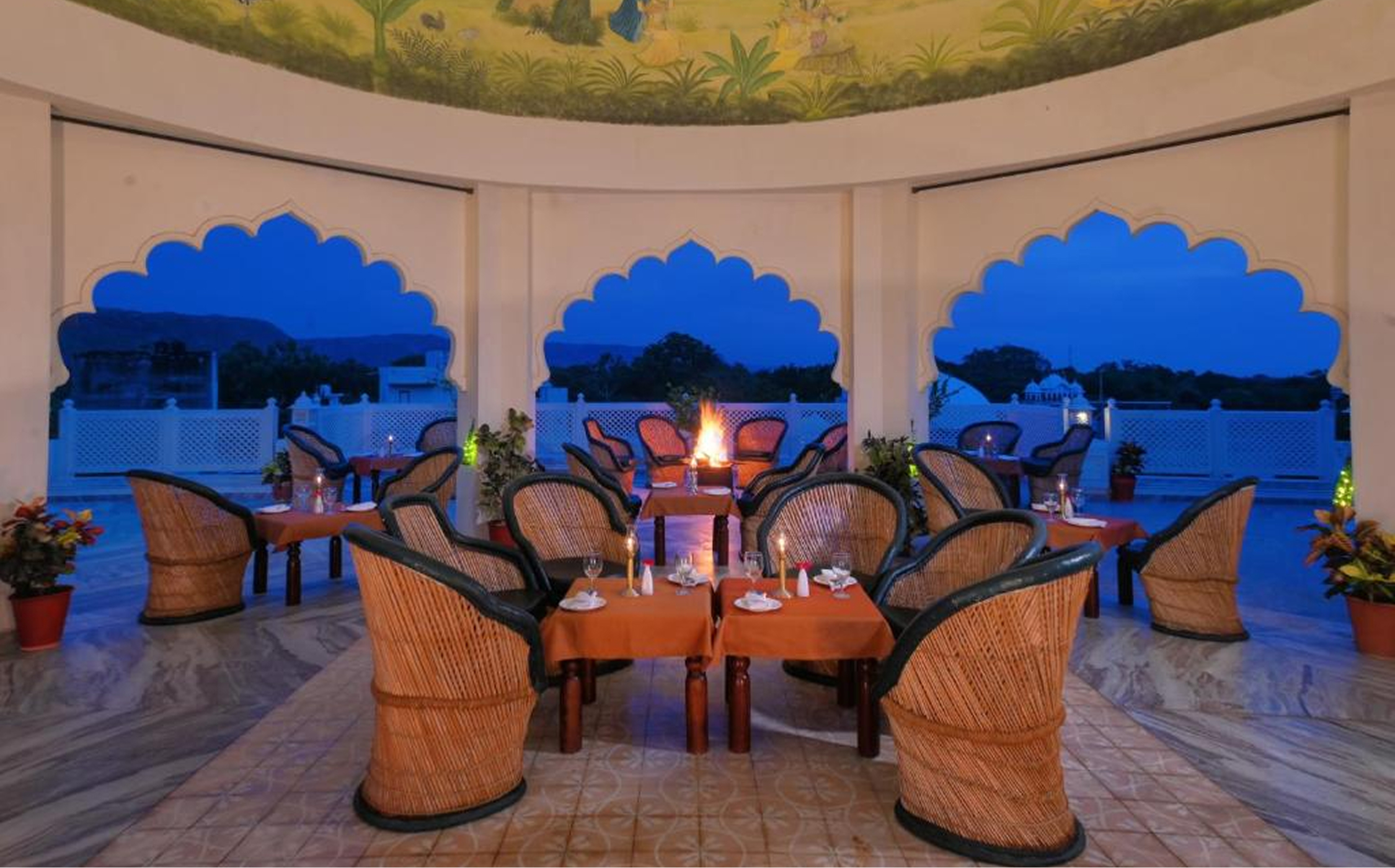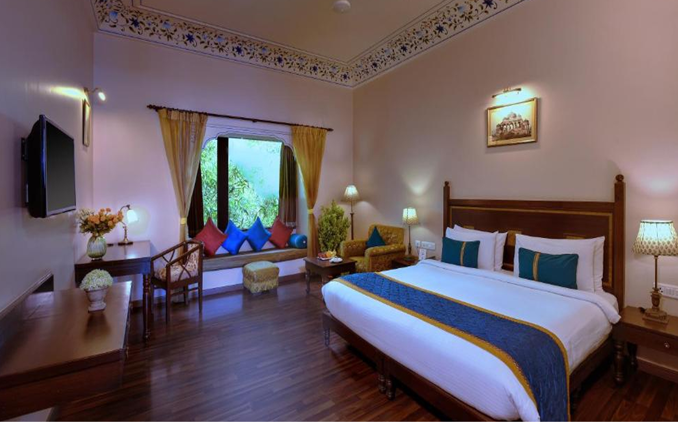 With its pristine-white Rajasthani‑haveli architecture, lush gardens and tranquil swimming pools, Anuraga Palace exudes regal grandeur. The elegant accommodations feature hand-painted ceilings and modern comforts like air-conditioning and Wi‑Fi. Dining at Basant restaurant delights with breakfast buffet featuring an array of international favourites as well as alfresco dinners amid beautiful surroundings. Located just minutes from Ranthambore National Park, the hotel offers seamless access to unforgettable safaris in search of the elusive Bengal tiger.