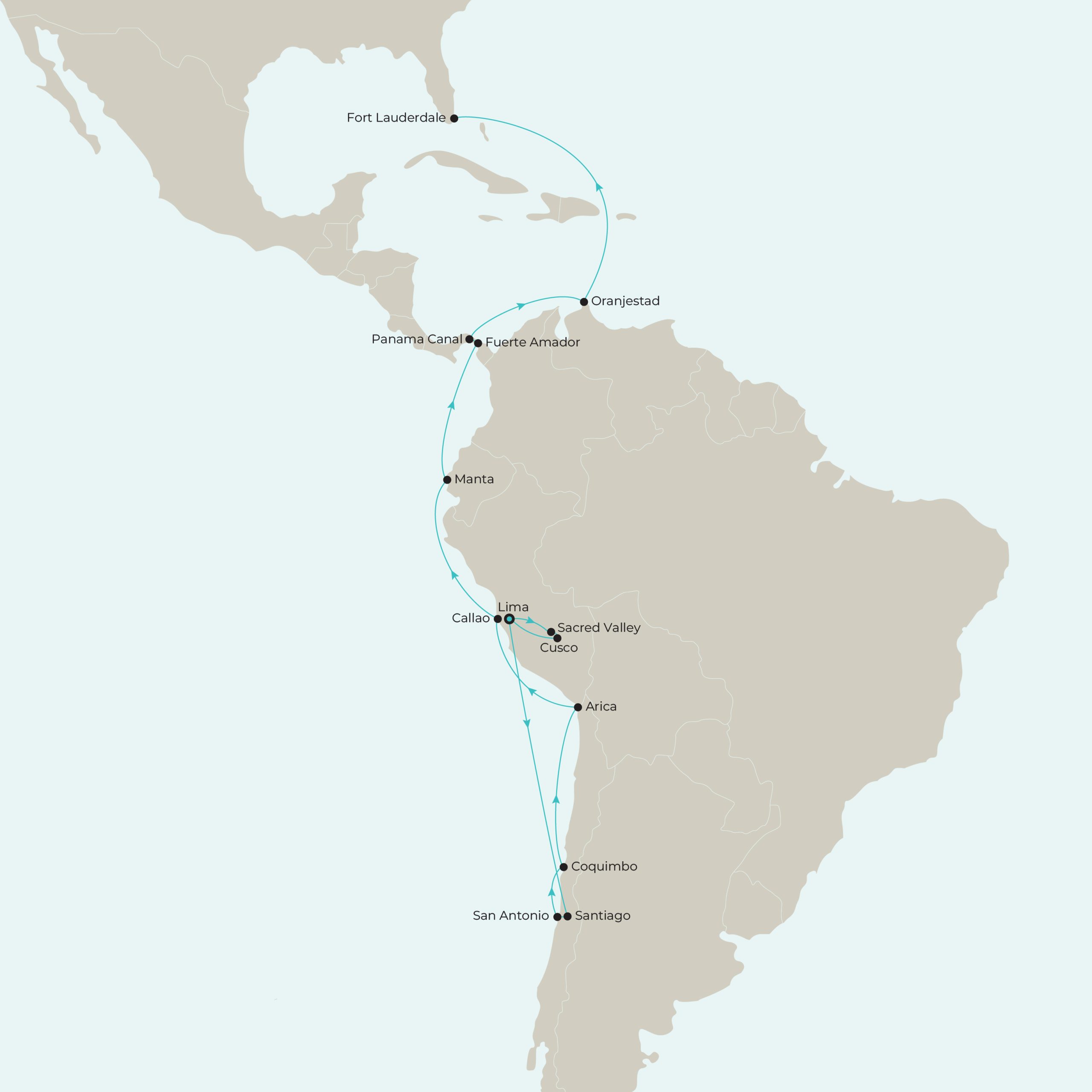 After your time in Peru, board Queen Anne for an intimate cruise through five captivating countries. Your voyage will take you to Chile, Peru, Ecuador, Panama, and the Caribbean, with highlights including overnight stays in San Antonio and Callao, the charming Oranjestad with its colorful Dutch colonial buildings, and a full Panama Canal transit.
