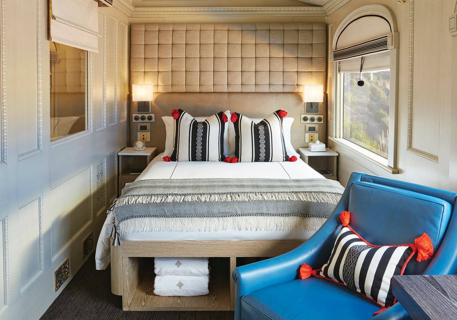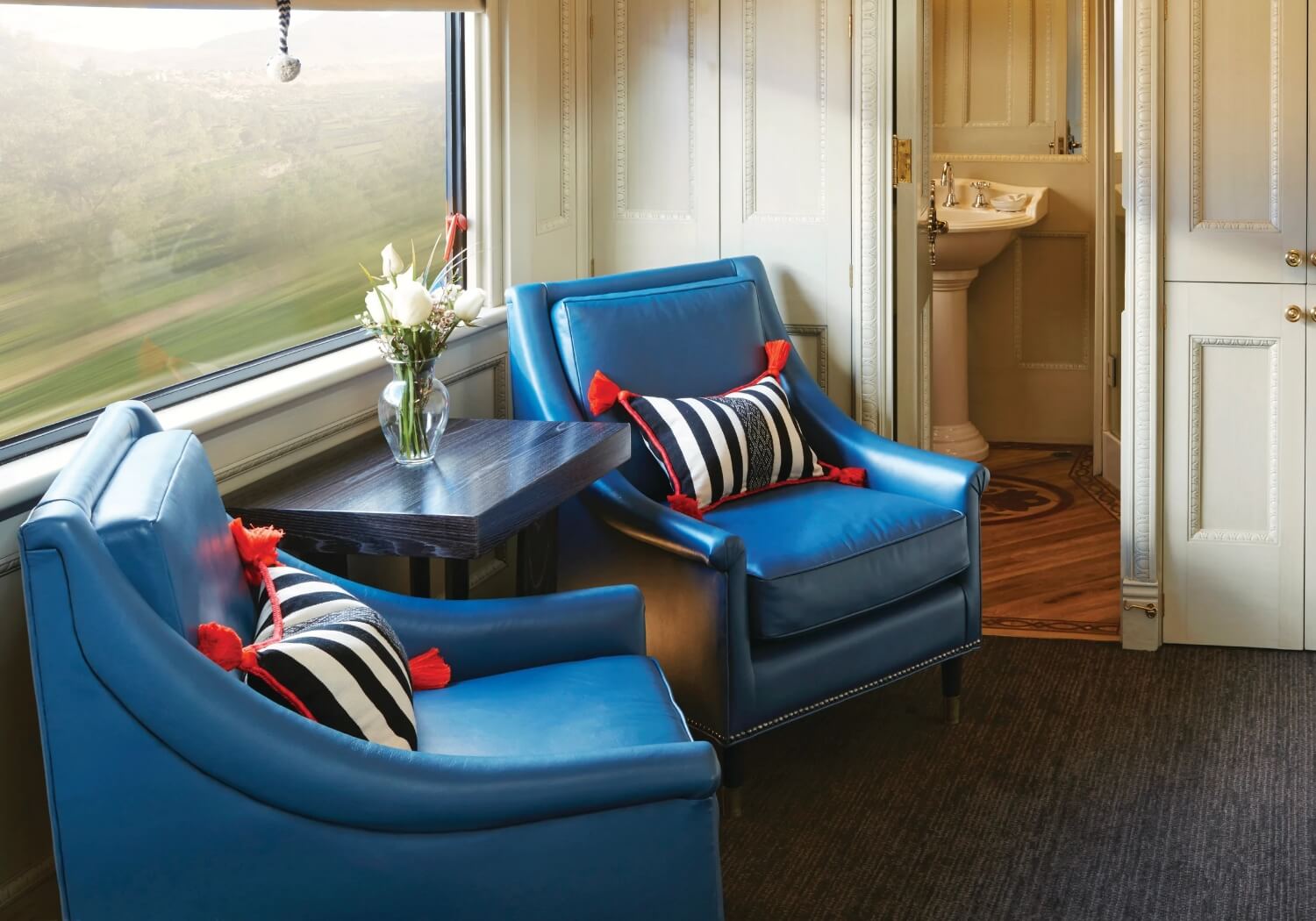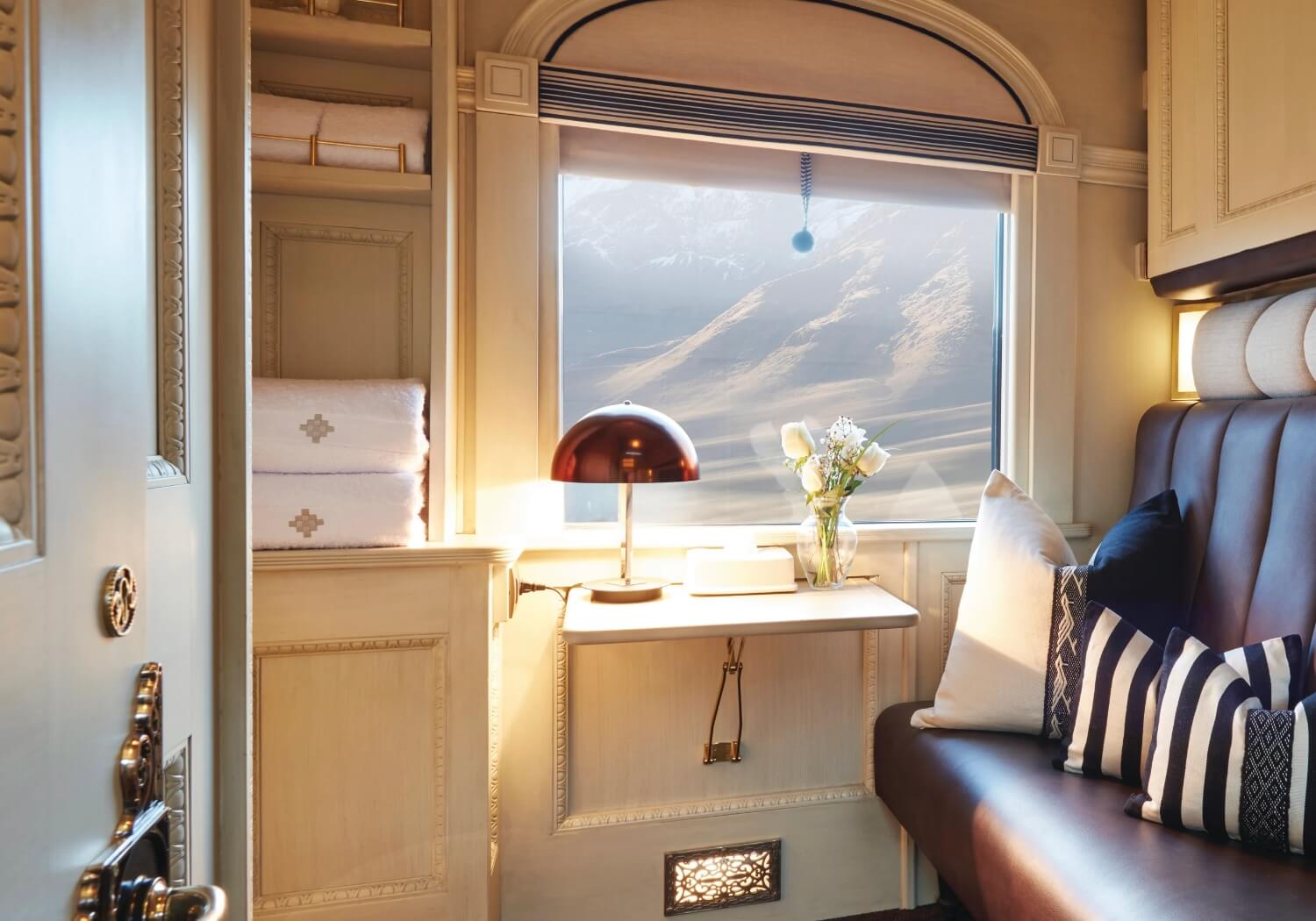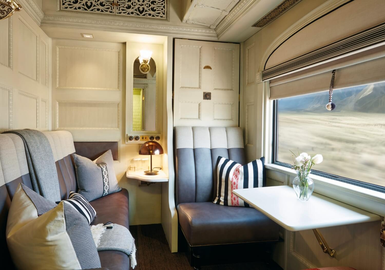 These beautiful suite cabins are adorned in tactile fabrics like alpaca wool and leather and feature a permanent, plush double bed and cozy seating area with two chairs and a table––perfect for unwinding after a day filled with exploration. Fitted with a compact wardrobe, private en suite with shower, washbasin and WC, this 13.1m2 space offers the most elegant retreat on board the train.