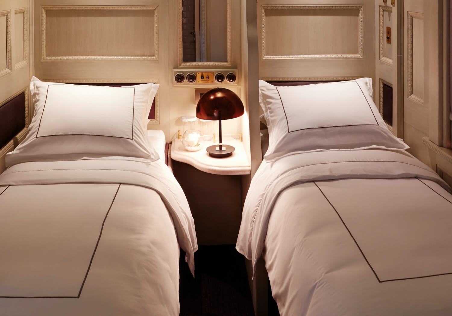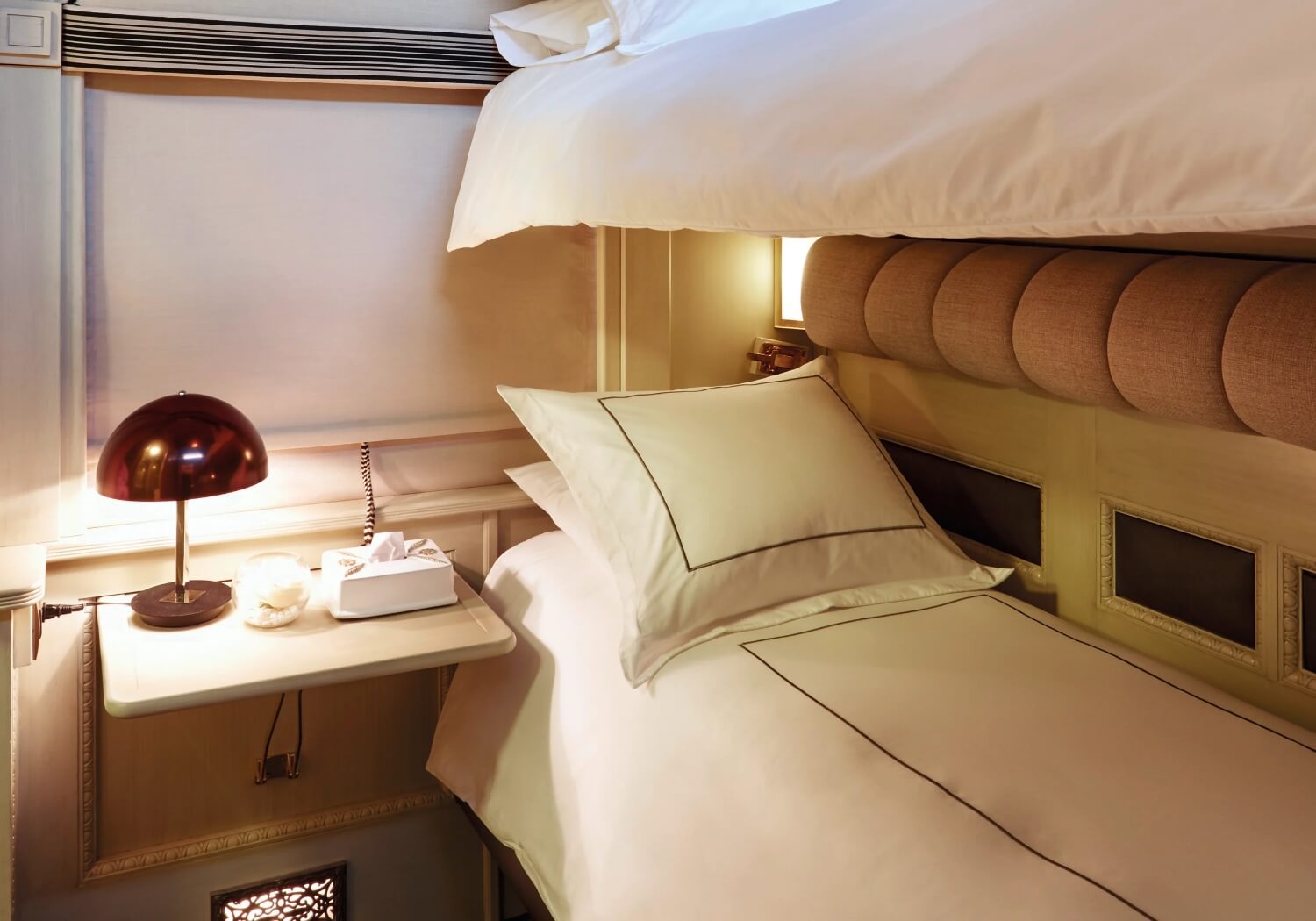 Evoke the glamour of the Golden Age of rail travel in a 5.5m2 Bunk Bed Cabin, with two single beds arranged in an upper and lower berth configuration, which is transformed into a banquette during the day.