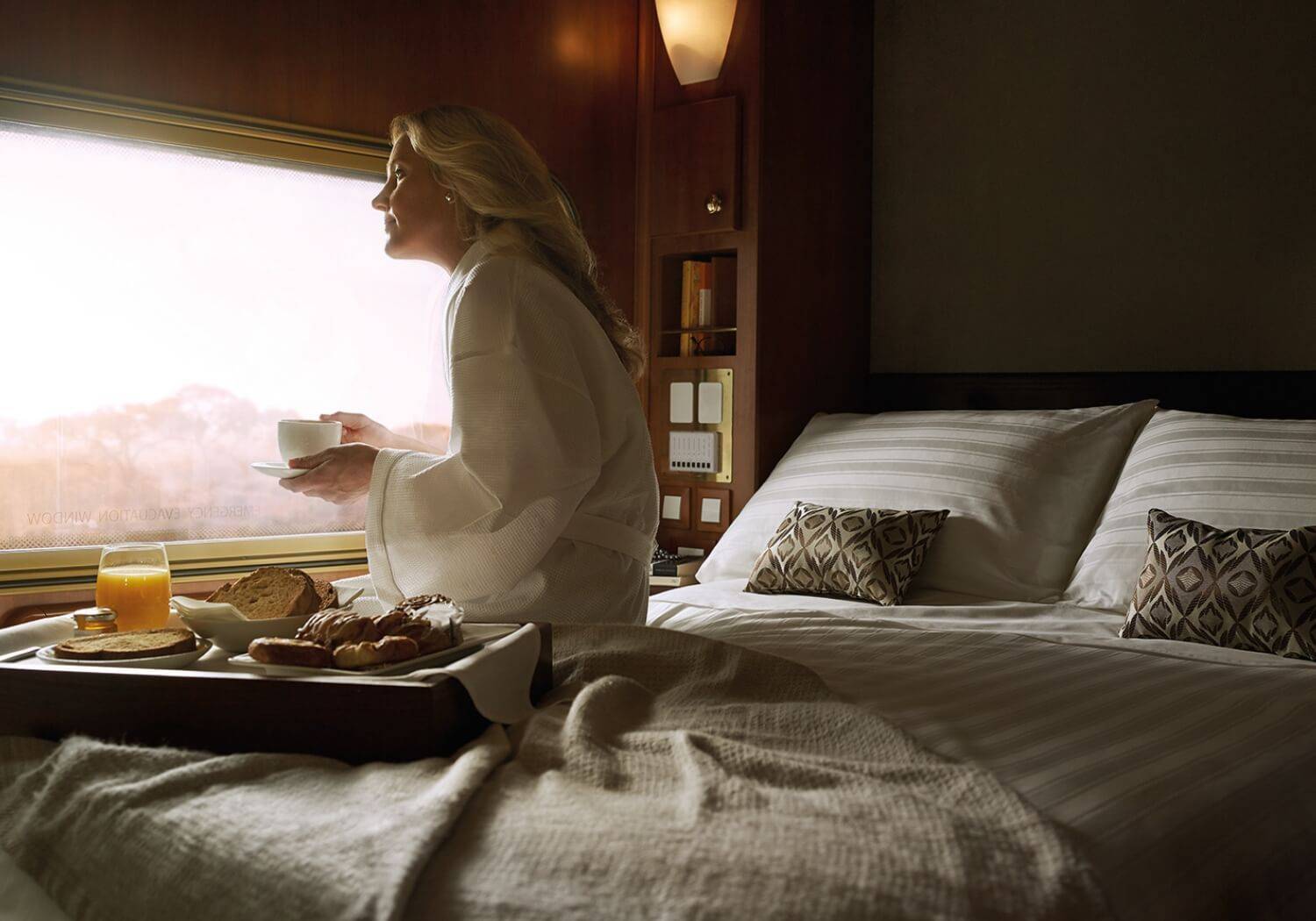 All Gold Service cabins come with a wash basin and use of shared toilets and showers located at either end of the carriage, plus crisp bed linen, bath towels, pillows and toiletries provided by your attendant. In comparison to the elegant Edwardian décor of the dining cars, the contemporary cabins are luxuriously appointed from wood and feature all the modern comforts you desire.