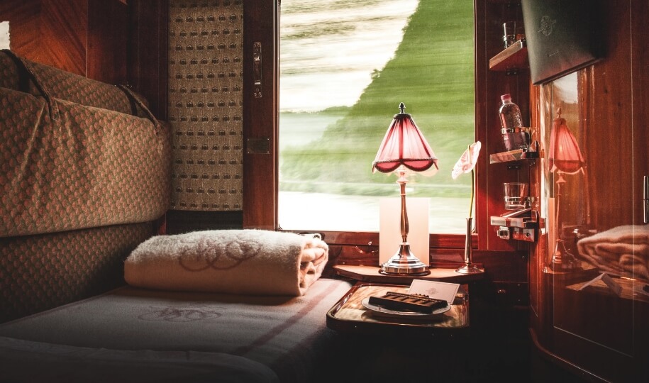 The restored 1920s sleeper cabins are some of the most luxurious train accommodations in the world. Each one is beautifully appointed with exquisite craftsmanship, such as bespoke soft furnishings and polished wood.